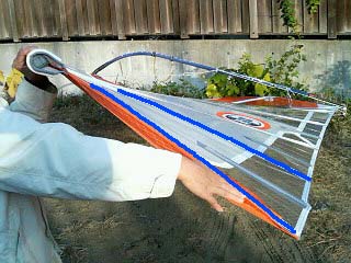 アクション系セイルの場合、バテンが真っすぐライン(青線)を描くのが最適ダウンテンションの目安。ひとつ注意として、ダウン不足でもバテンは真っすぐラインを描くため、このテンションを探す時は、一度強めにダウンを引き(バテンが下向き曲線を描くまで)、徐々に緩めながら(幾度もトップを持ち上げて確認して)行う。「強」から「弱」へテンションをチューニングすることで最適を探し出そう。写真はニールの08モデルCOMBAT。 ただし、アクション系セイルであっても、走り重視のセッティングを望むなら、前記したプレーニング系セイルと同等までダウンを追加する。すなわちバテンが(押して)下向きカーブを描くまで。そうしてダウンを強めにすることで、セイルを引き込み続ける際のセイル安定感を高めることができる。 |