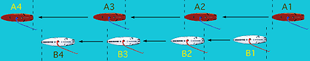 風下側からオーバーテイキング(相手を抜く)する場合、優先権を持つのは下のイラストの黄色文字で示された艇です。(オレンジのボードがオーバーテイキング中/イラストの上側が風上) A1-B1/Aはクリア・アスターン、Bはクリア・アヘッドなのでBに優先権があります。なのでオーバーテイクしようとするAは前を走るBに追突してはいけません。またBは、抜かれないようにAをブロックすることが許されます。 A2-B2/Aが追いついてオーバーラップしました。この状態でもまだBに優先権があります。なのでAはBを避けるように抜かなければなりません。 A3-B3/風下からオーバーテイクするときは、こうしてノーズが相手のノーズよりも前に出たら優先権が移行します。風上からオーバーテイクするときと比較すると優先権の移行条件に違いがあるのがわかるでしょう。 A4-B4/AがBを完全に抜き去ってクリア・アヘッド、クリア・アスターンの状態になりました。もちろん優先権はAにあります。 |